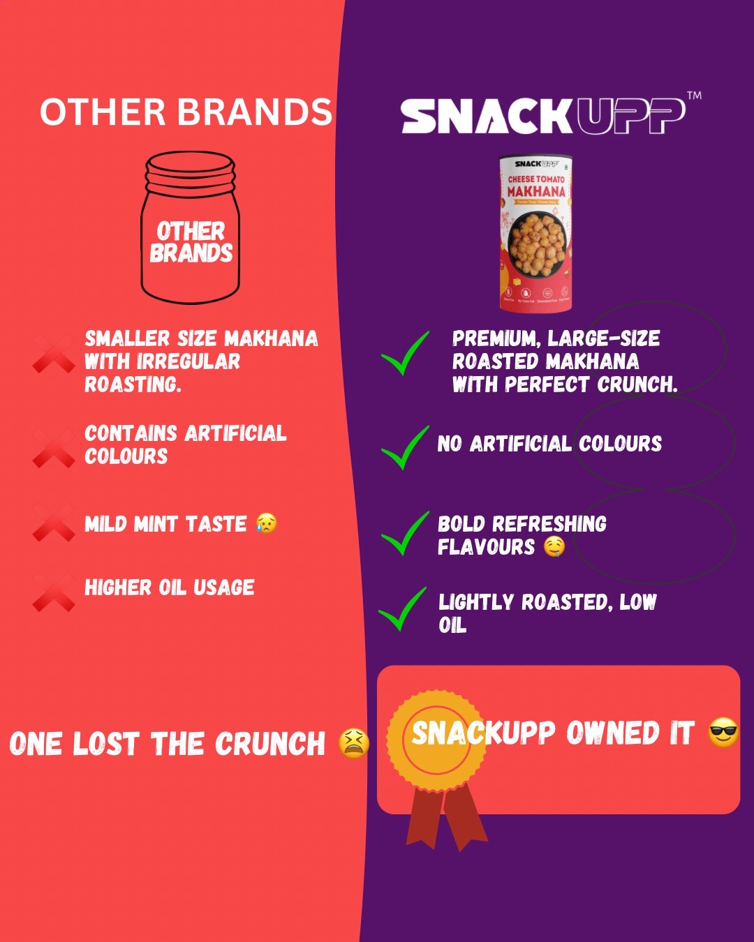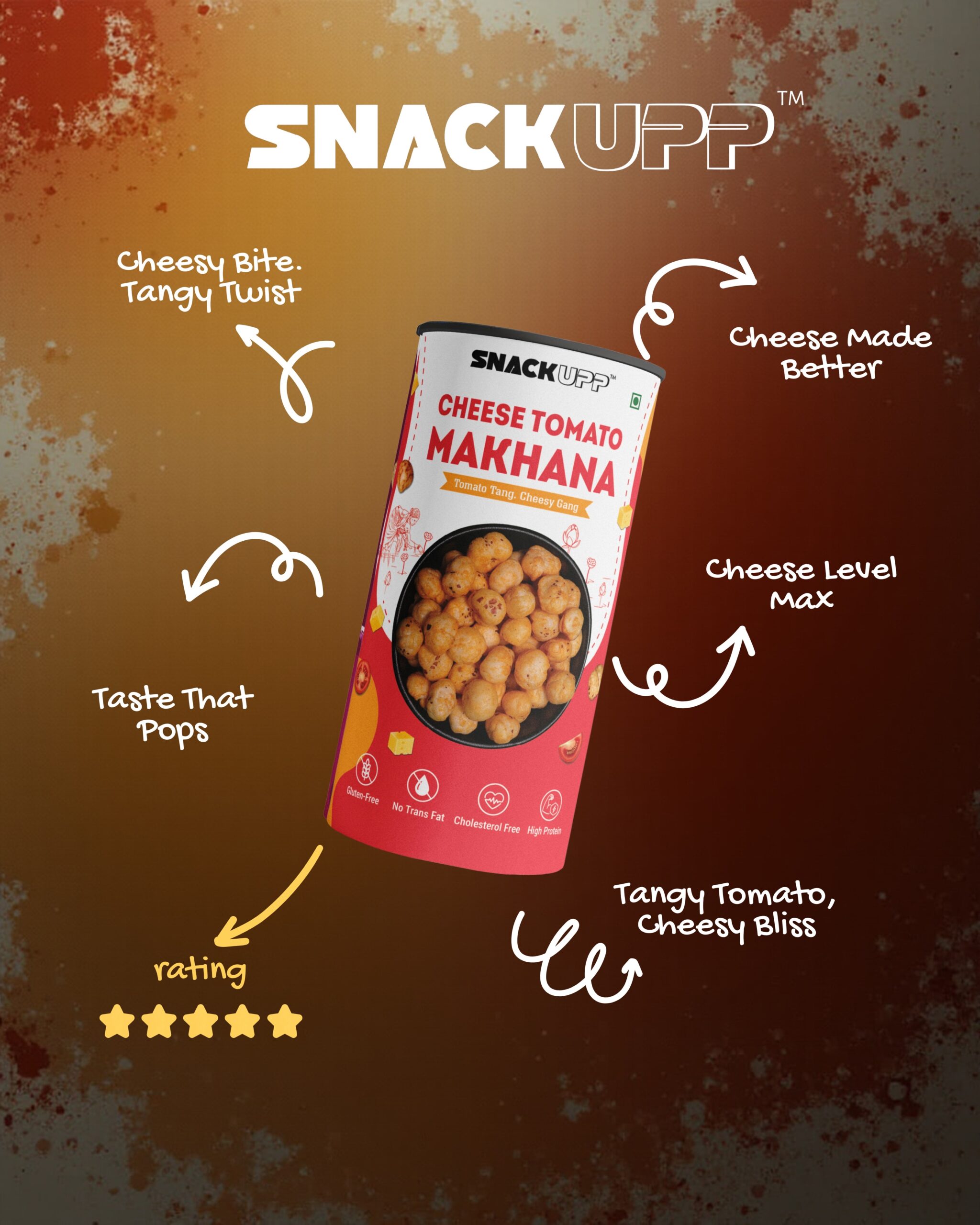 Loved by Kids & Adults From kids’ tiffins to movie-time munching, Cheese Tomato Flavoured Makhana is a fun, flavour-packed healthy snack.